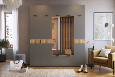 Прихожая Бери станет функциональным решением для обустройства малогабаритной входной зоны. Закрытая система хранения предусматривает выдвижную штангу для вешалок, полки для сложенной одежды и тумбу для обуви. Открытая зона оснащена четырьмя однорожковыми крючками для верхней одежды и нишей для головных уборов. Вставки на фасадах, украшенные вертикальной фрезеровкой, придают мебели оригинальный вид. Зеркальное полотно позволит оценить подобранный образ.