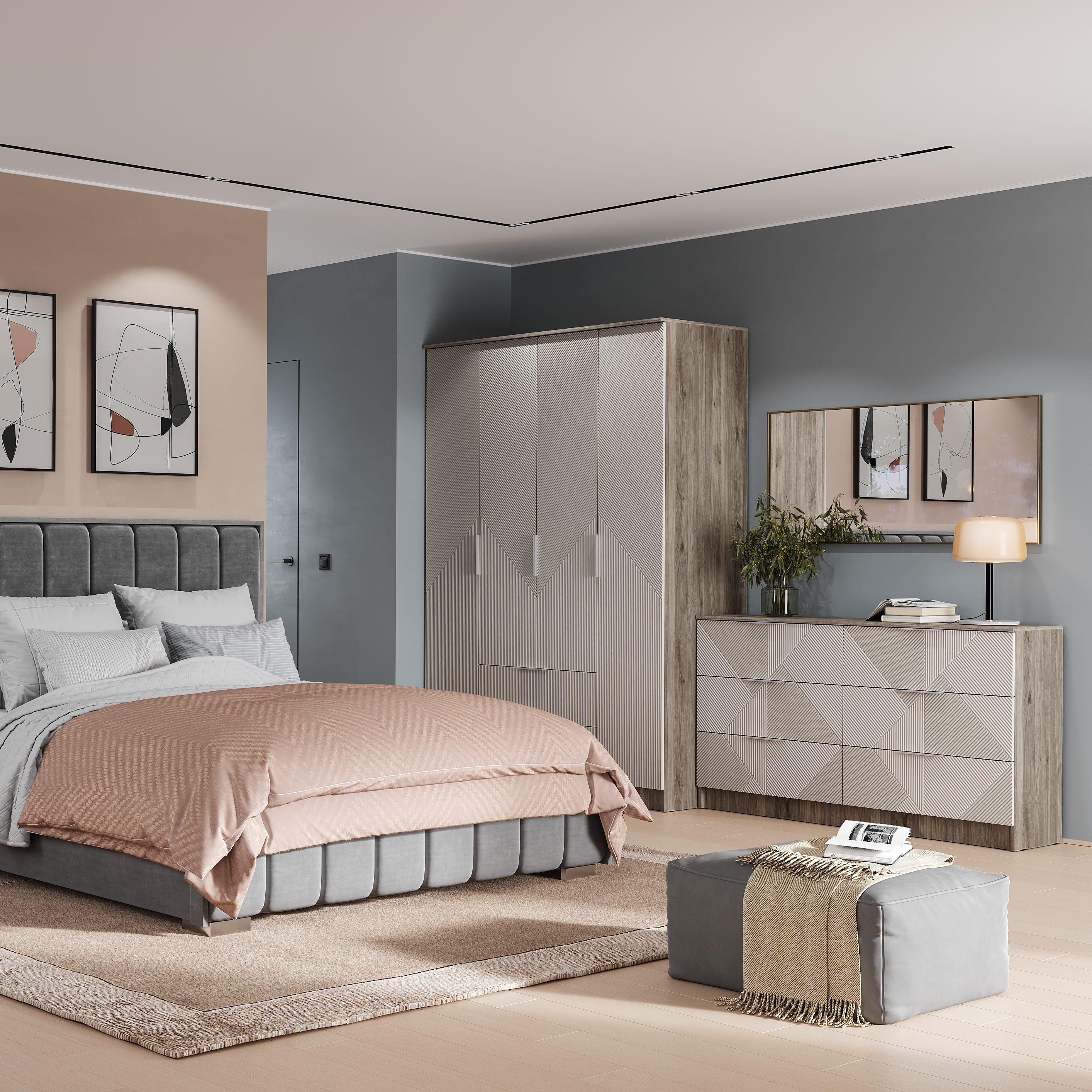 Четырехстворчатый шкаф «Эмилия» ШК-11 воплощает лучшие тенденции современного мебельного дизайна. Нежная цветовая гамма «дуб смоки» и «айриш» в сочетании со стильной фрезеровкой фасадов наполняет пространство светом и воздухом. Модель продумана до мелочей: боковые полки для аккуратного хранения, центральные секции для повседневной одежды на плечиках и два вместительных нижних ящика для обуви или постельного белья.